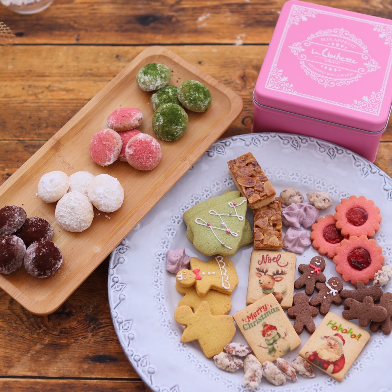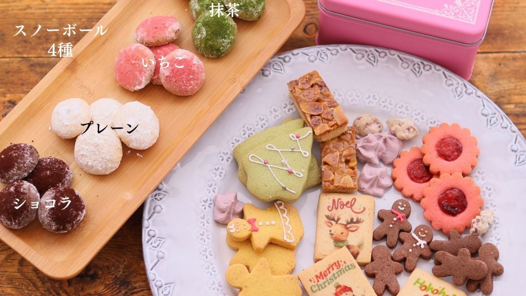 フロランタン2枚、サブレフレーズ3枚、ジンジャーマン6枚、ツリー3枚、天使3枚、プリントクッキー3枚、スノーボール抹茶4個、プレーン4個、ココア4個、いちご4個、アマンドサレ10粒、メレンゲ4粒
