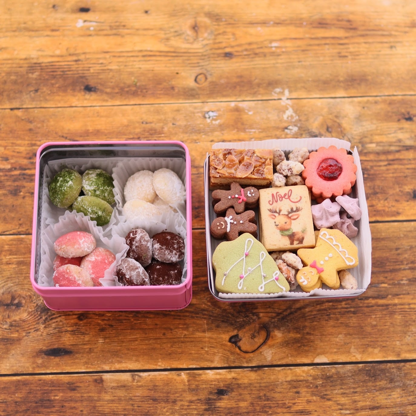 サンタがこっそり届けてくれるような、遊び心いっぱいの缶の中には、カラフルで繊細な焼き菓子たちがぎゅっと詰まっています。